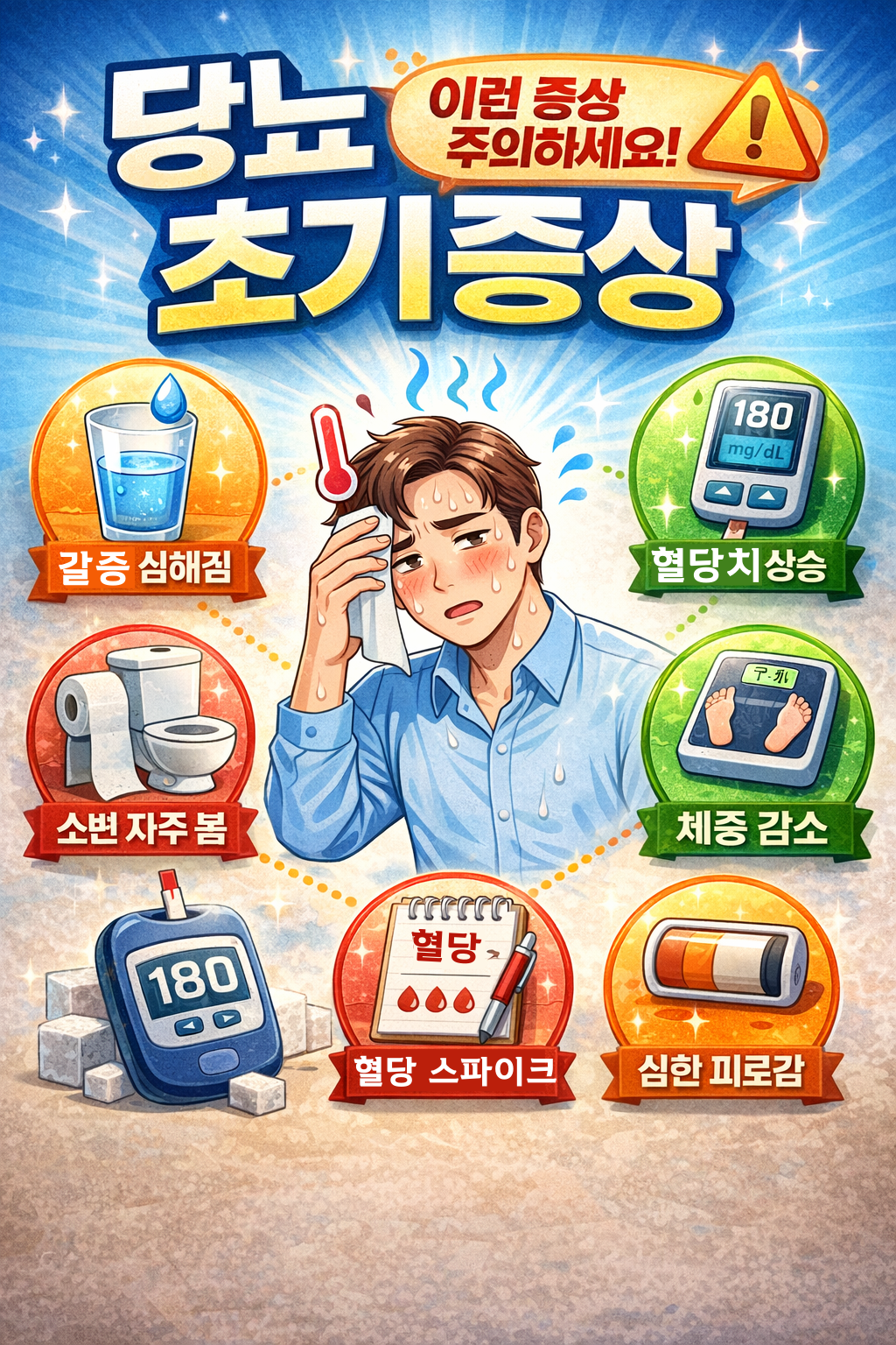 많이 먹고(다식), 물을 많이 마시며(다음), 소변을 자주 보는(다뇨) '3다(多)' 증상은 당뇨의 고전적 신호입니다. 하지만 여기서 우리가 가장 쉽게 속는 함정은 바로 **'이유 없는 체중 감소'**입니다.
