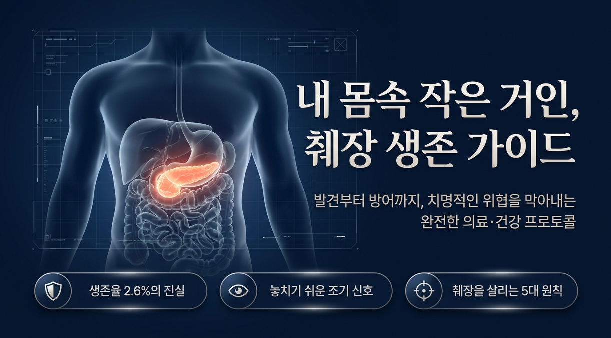 췌장암 4기 생존율은 단 2.6%. 100명 중 97명이 넘는 이들이 돌아가시는 이 비극적인 수치는 췌장이 복부 가장 안쪽인 '후복막'에 숨어 자신을 철저히 감추고 있기 때문입니다. 길이 20cm, 무게는 미미하지만 소화 효소 분비와 혈당 조절이라는 '더블 잡'을 수행하는 췌장은 우리 몸의 고단한 '소녀 가장'입니다. 이 작은 거인이 비명을 지르다 결국 암세포가 겹겹이 두른 '철갑옷(종양 미세환경)' 속에 숨어버리기 전에, 우리는 이 '침묵의 칼날'로부터 살아남을 생존의 기술을 익혀야 합니다.