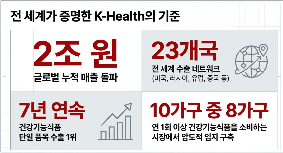 이는 대량 생산을 통한 원가 절감과 유통 구조의 혁신을 오롯이 소비자 혜택으로 돌려준 '거꾸로 경영'의 모범 사례입니다. 이러한 진정성은 시장에서 폭발적인 반응으로 이어졌습니다. 현재 미국, 중국 등 전 세계 23개국에 진출하여 글로벌 누적 매출 2조 원을 돌파하는 등 'K-면역'의 글로벌 스탠다드를 정립하고 있습니다.