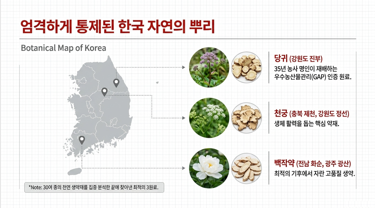 헤모힘의 근간은 한국의 청정 자연에서 자란 세 가지 생약재인 **당귀(강원도 진부), 천궁(충북 제천/강원 정선), 백작약(전남 화순/광주 광산)**에 있습니다. 하지만 헤모힘은 단순히 약재를 달인 기존 한방 추출물과는 그 궤를 달리합니다.