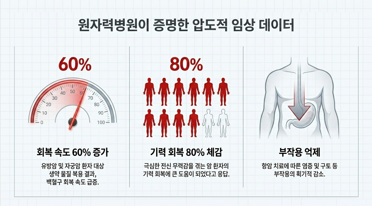 특히 암 환자를 대상으로 한 임상 시험 결과는 놀라웠습니다. 유방암 및 자궁암 환자들의 회복 속도가 약 60% 향상되었으며, 복용 환자의 80% 이상이 기력 회복 및 무력감 해소에 대해 긍정적인 답변을 내놓아 그 과학적 실체를 입증했습니다.