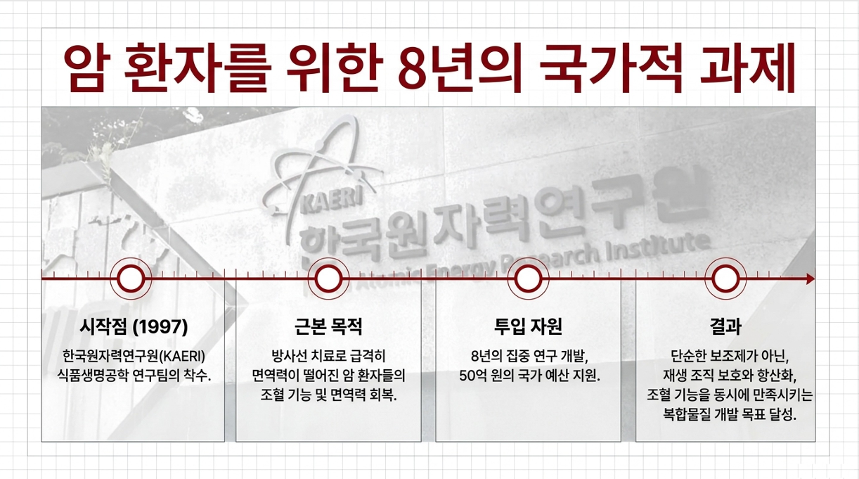 헤모힘은 이윤 추구를 목적으로 하는 민간 기업의 상업적 아이디어에서 시작된 제품이 아닙니다. 1997년, 한국원자력연구원 식품생명공학연구팀은 방사선 노출 위험이 있는 연구원들과 방사선 치료로 면역력이 급격히 저하된 암 환자들을 보호하기 위해 연구를 시작했습니다.