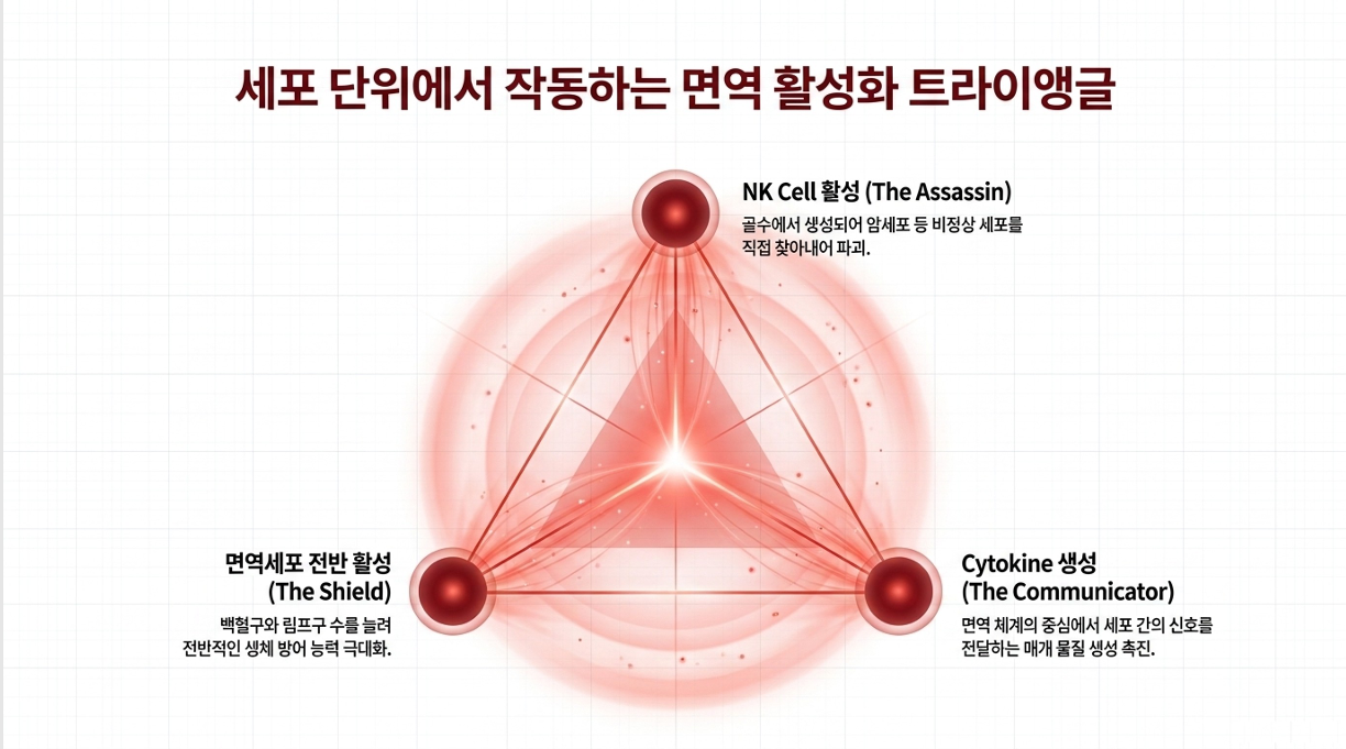 - NK 세포(자연살해세포) 활성화: 비정상 세포나 바이러스 감염 세포를 직접 찾아내 즉각 파괴합니다.